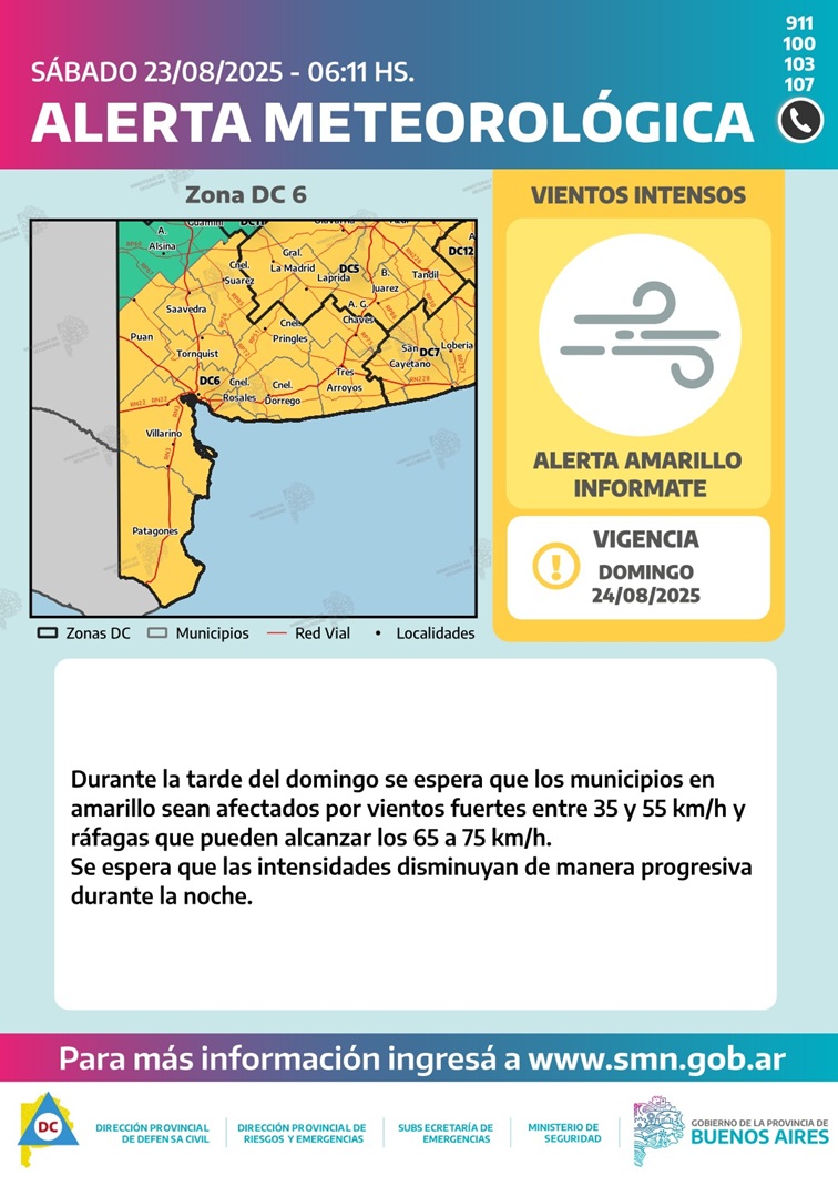 Informe meteorológico- Descripción alerta amarilla por vientos - Domingo 24/8